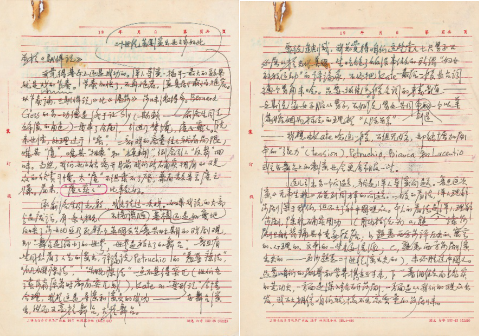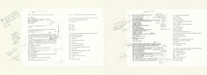 从现存的审稿手迹中可以看出,用“呕心沥血”来形容陆老师编纂词典的态度也不为过。几乎没有一页的边缘没有陆老师密密麻麻的手写评注、增补、格式修改建议、优化提议(见本展柜手稿第2页左栏关于“词格分裂”的说明)。陆老师认为词典是给当下的世人用的,汉英词条的翻译需要与时俱进,哪怕像“铲车”(forklift, track)这样不起眼的单词,也会建议添上bulldozer等不同语境下可能适用的另类译法(本展柜第1页左栏),甚至费尽心思为新语境中同一个汉语单词“创造”新的英语译法供词典工作组成员商榷。陆老师编纂词典的态度可谓将谨小慎微与锐意创新都做到了极致。