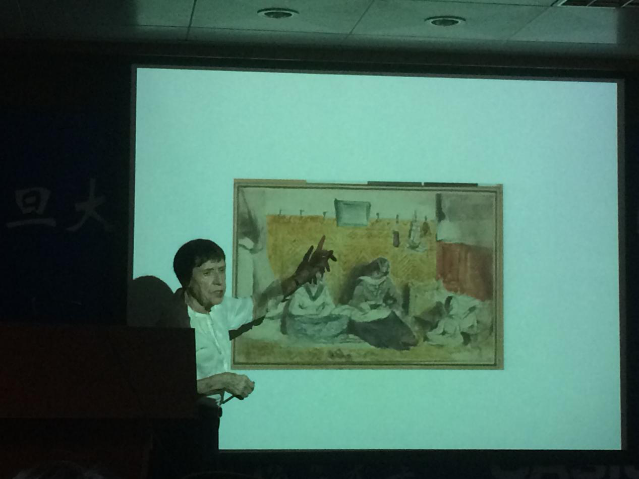 从《但丁的小舟》到《希阿岛的屠杀》,从为《浮士德》创作的插画到《自由引导人民》,再到摩洛哥旅行时期所创作的《阿尔及尔的女人》、《摩洛哥的犹太人婚礼》等画作,Claude Imbert教授梳理了德拉克洛瓦在不同时期艺术创作的转变与发展;通过对杰里科、鲁本斯等影响画家绘画基调的相关人物及其作品的分析,介绍了德拉克洛瓦画作中所继承的色彩、结构特点,解读了其中蕴含的历史、社会的隐喻。Claude Imbert教授重点结合对画家在摩洛哥之行中创作的《阿尔及尔的女人》等一系列水彩画的分析,阐释了其中包含的“东方主义”元素:德拉克洛瓦通过水彩、油画等表达工具,以一种“翻译”的视角来展现异域文化,体现了十九世纪早中期绘画中的现代主义。