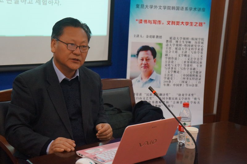 金虎雄教授以“读书与写作,文科类大学生之路”为主题开展讲座。讲座由万象城网页版,万象城(中国)韩文系主任黄贤玉教授主持。