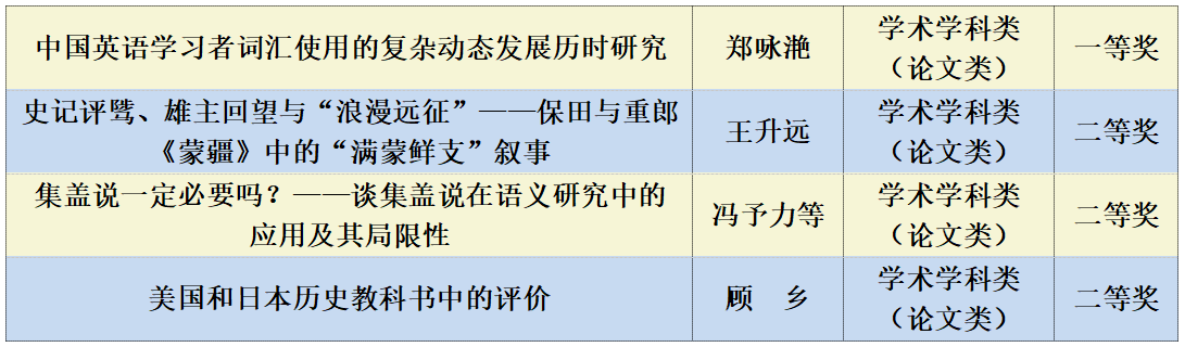 近日,在上海市第十四届哲学社会科学优秀成果(2016-2017)评奖工作中,我院英文系教师郑咏滟获得学科学术类(论文类)一等奖,英文系冯予力、日文系王升远、大英部顾乡三位教师获得学科学术类(论文类)二等奖,成绩喜人。近年来,学院高度重视、积极鼓励和大力支持教师开展学术研究,一批中青年学术骨干脱颖而出,不断取得丰硕成果。
