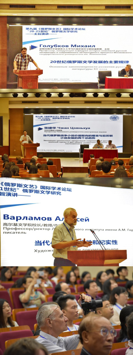 开幕式后,六位国内外顶尖学者和作家依次做大会主旨发言。他们分别是莫斯科大学当代俄罗斯文学教研室主任М. Голубков教授,北京外国语大学张建华教授,俄罗斯高尔基文学院校长兼作家А.Варламов教授,俄罗斯著名当代作家В.Ерофеев, 华东师范大学陈建华教授,俄罗斯侨民基金会研究员Т. Тюрина。六位学者和作家的演讲囊括了20-21世纪俄罗斯文学中的重要问题,其中既涉及近一百多年来俄罗斯文学发展进程的主要规律和特征,也涉及不同的文学流派和思潮,还涉及书写主题和研究现状。