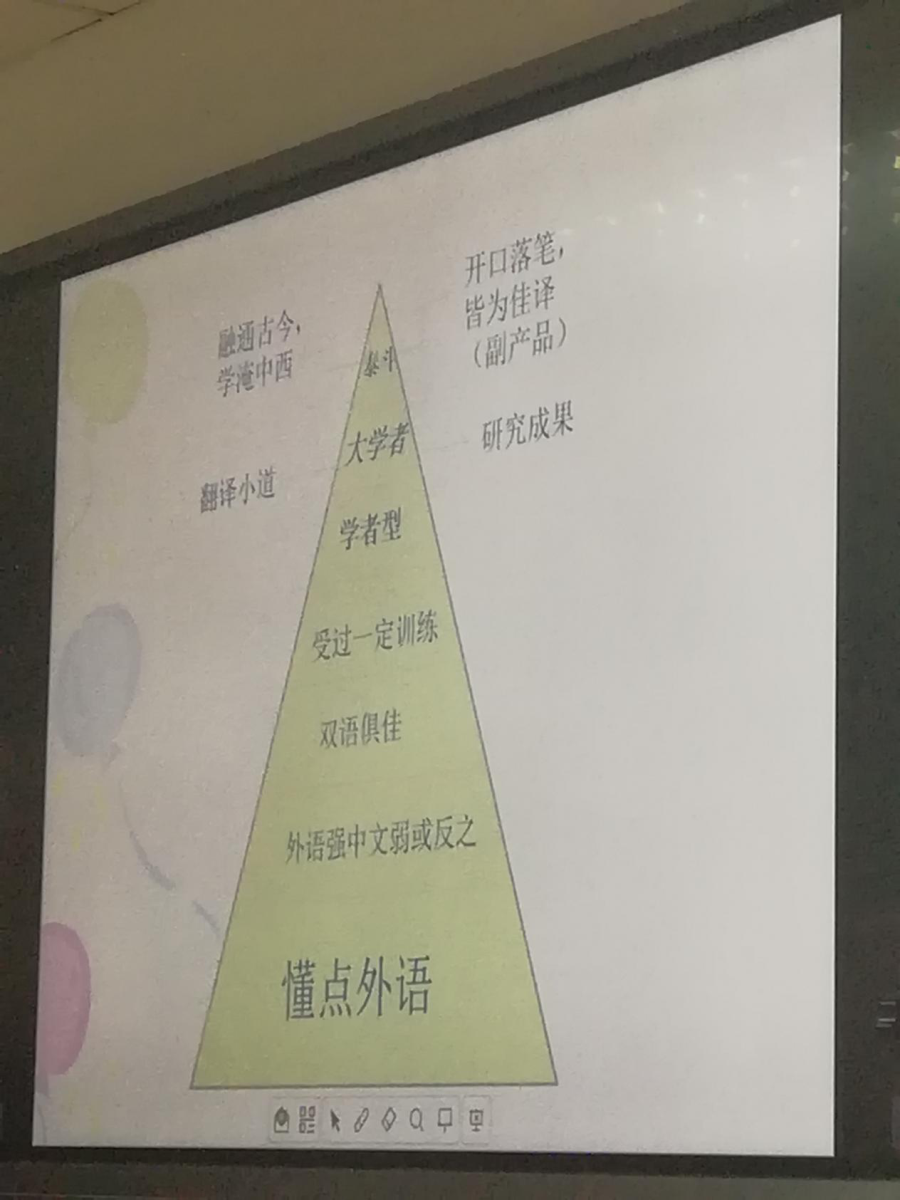 讲座的最后,何刚强教授提出了展现翻译研究不同境界的“金字塔图”,特别关注了翻译人才短缺的问题。他指出,在当代中国社会外语整体水平提高的背景下,双语水平俱佳、受过正式的翻译指导、训练的人却大幅度减少,能旁征博引、学贯中西的大学者和泰斗级人物更是少之又少,这是翻译学界的遗憾,同时,培养这类型的人才也是学界共同努力的方向。