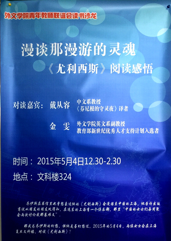 五月四日, 外文学院青年教师联谊会读书沙龙第二场活动在文科楼324房间如期举行。本场活动以《漫谈那漫游的灵魂—— <尤利西斯>阅读感悟》为题,由中文系教授戴从容和外文学院副教授金雯进行对谈,两位女性协同解读这本被称为世界文学“天书”的《尤利西斯》,对谈由外文学院副教授范若恩主持。