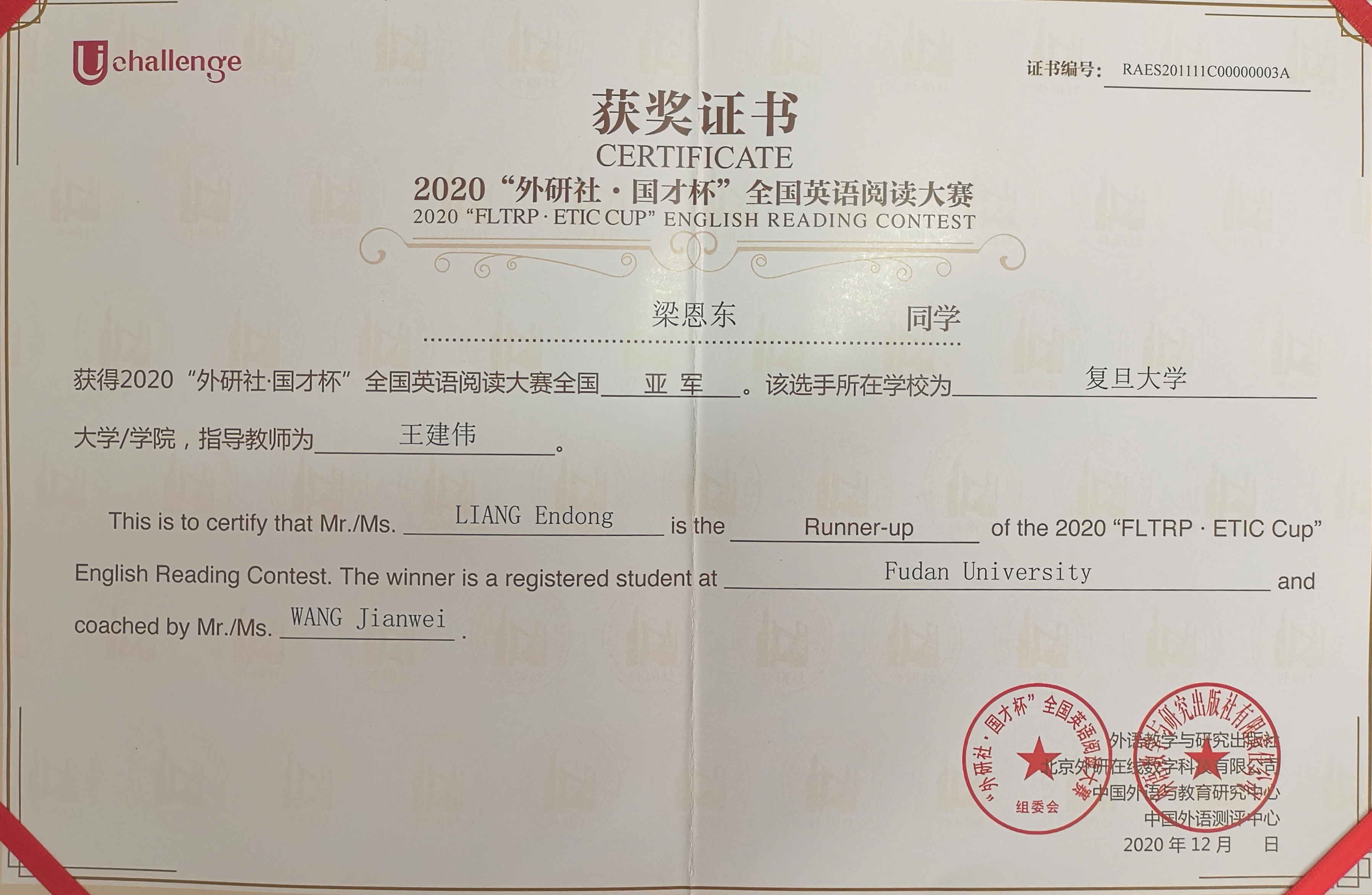 此前,在11月份举行的2020“外研社•国才杯”大学生英语挑战赛上海赛区阅读比赛中,经济学院 梁恩东 同学获特等奖、外文学院 韦家宝 (指导教师 王建伟)获三等奖;演讲比赛中,外文学院 舒玥 同学 获二等奖;写作比赛中,周慧钰(指导教师 管阳阳)、张点点(指导教师 郭骅)、李臻欣(指导教师 杜方圆)荣获三等奖。在10-11月的全国英语演讲大赛网络赛场,我校 杨晨、陈琳、陈紫安、黄怡韵、史茹文 等几位同学也以优异的成绩脱颖而出,分获网络赛场二等奖及三等奖。