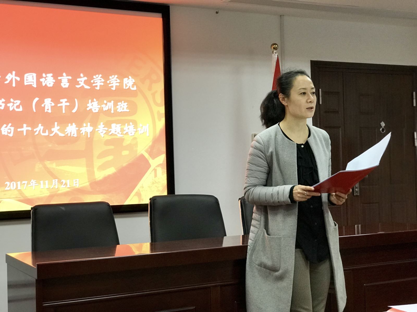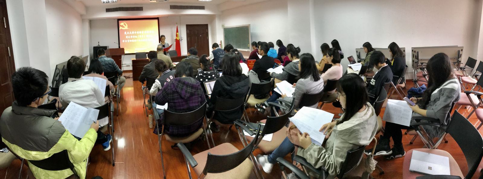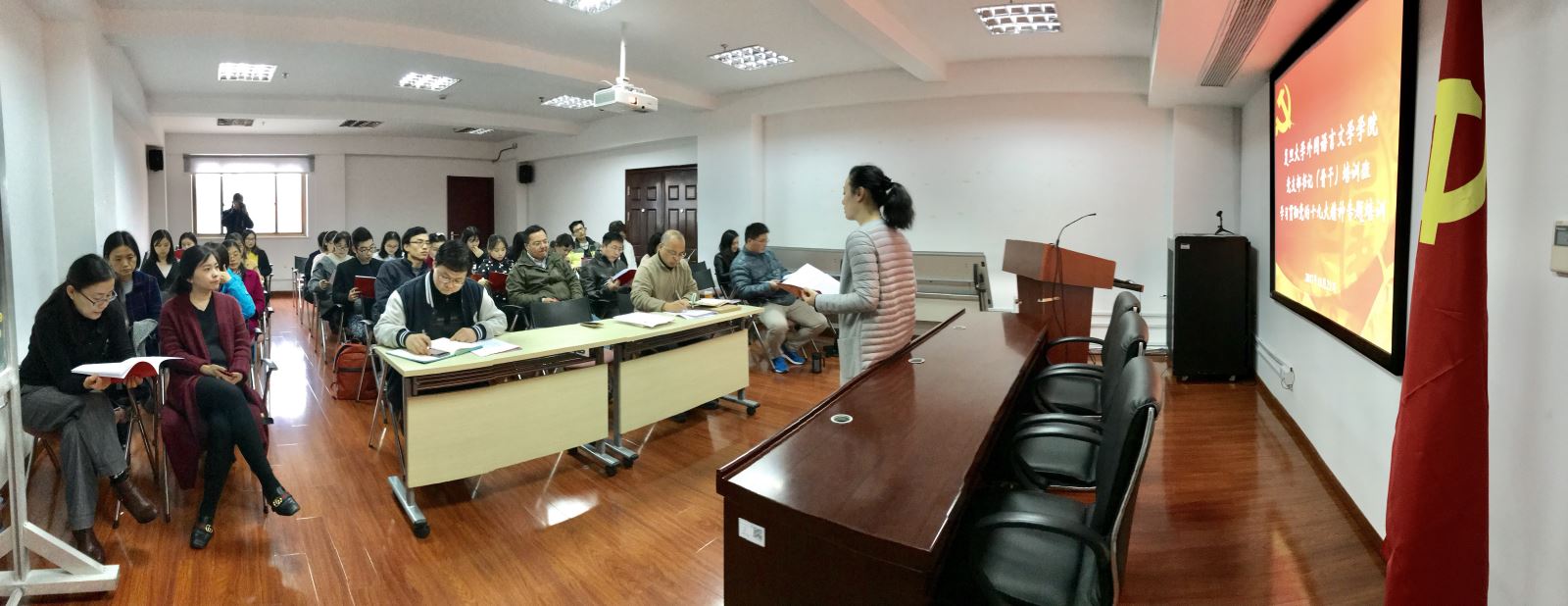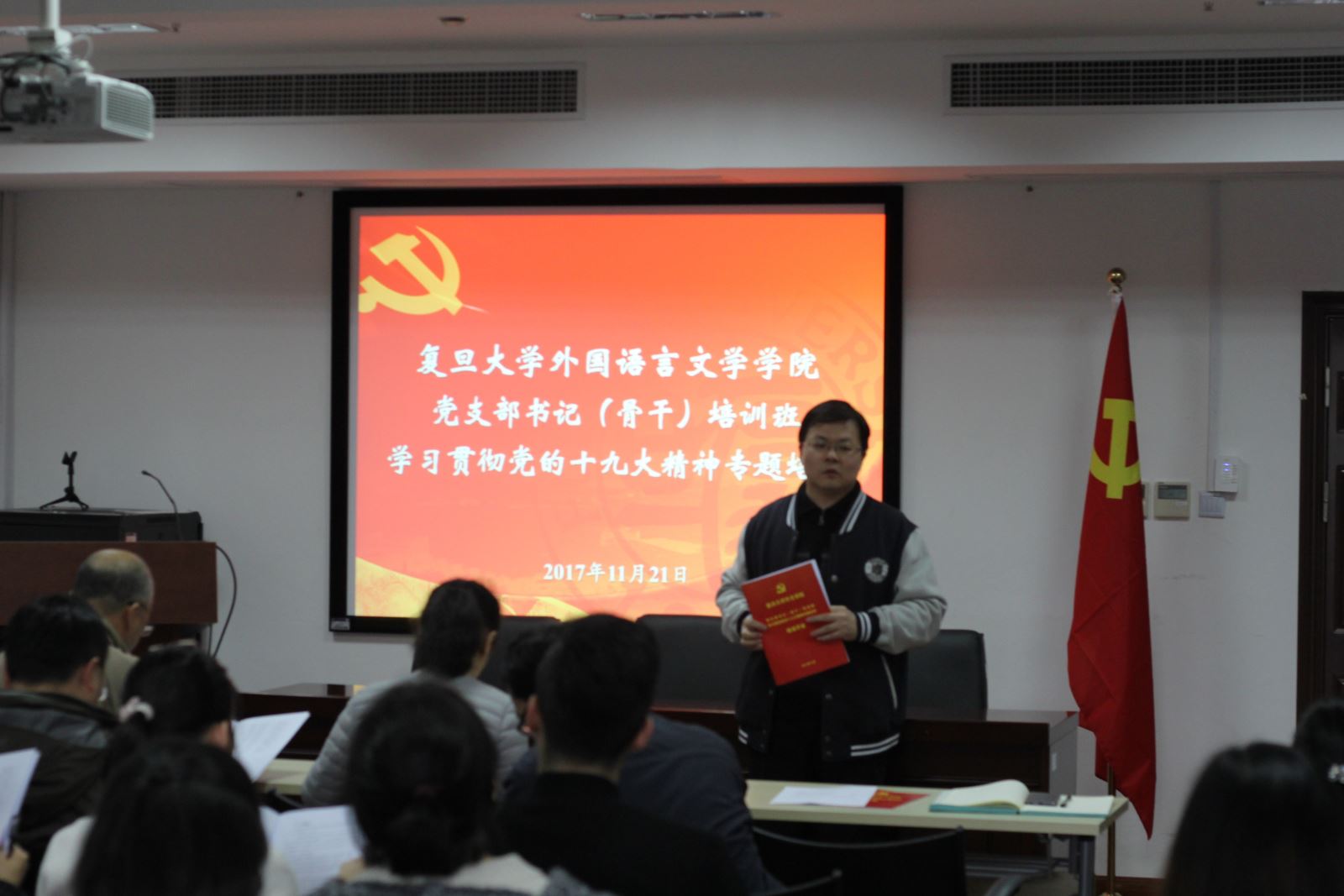 11月21日中午,外文学院分党委在文科楼510会议室举行“外文学院党支部书记(骨干)培训班·学习贯彻党的十九大精神专题培训”开班仪式。学院分党委委员、教职工党支部书记、学生党支部书记、学生辅导员、学生党支部和党章学习小组骨干参加活动。开班仪式由分党委副书记曾建彬主持。