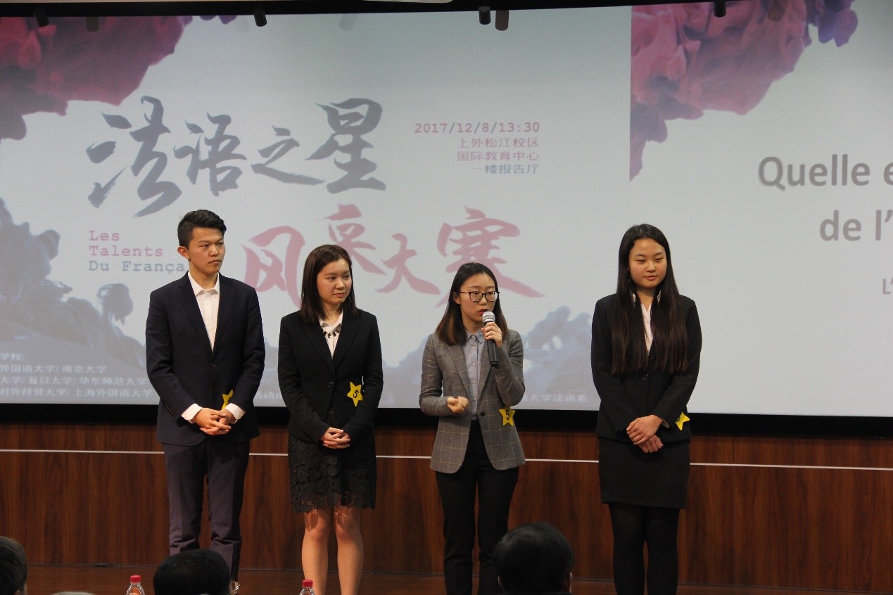 2017年12月8日下午,第九届全国“法语之星”风采大赛在上海外国语大学松江校区举行。经过一个下午的激烈角逐,万象城网页版,万象城(中国)法文系三年级本科生郭竞雯、钟雨桐、李天欣、赵一源4名同学组成的代表队,在演讲环节取得第二名的佳绩,最终荣获“法语之星”风采大赛二等奖。