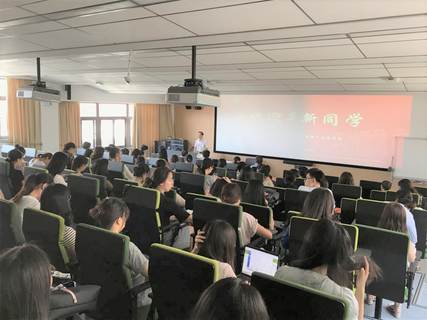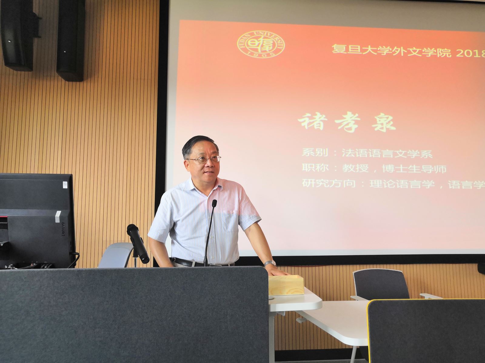 曲卫国院长首先致辞,他感谢大家选择复旦外文,并结合自身经历对新生提出期望:希望同学们找到自己的兴趣点、保持自己的语言水平、开放自己的思维方式,正确理解人生价值,安心做好学术。最后,曲院长殷切地欢迎同学们积极为学院发展建言献策。