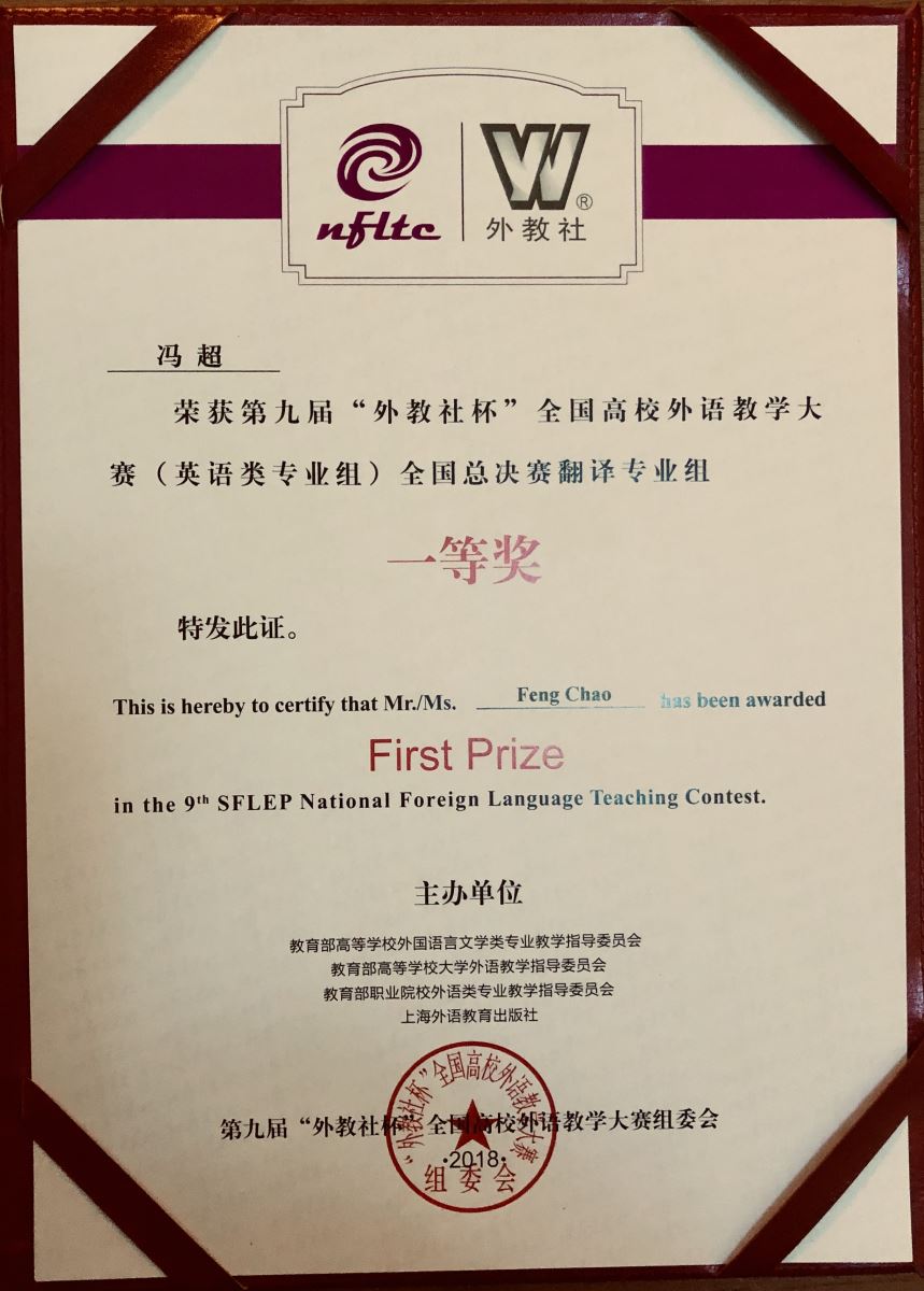 2018年12月2日,全国规模最大、级别最高、影响最广的第九届“外教社杯”全国高校外语教学大赛全国总决赛在上海外国语大学顺利落幕。万象城网页版,万象城(中国)外文学院翻译系冯超老师一路过关斩将,最终荣获全国总决赛翻译专业组一等奖。同时外文学院选送的翻译系本科生及研究生志愿者在全国决赛课堂互动中表现优异,助力大赛顺利开展,也受到了主办方及参赛选手的一致好评。