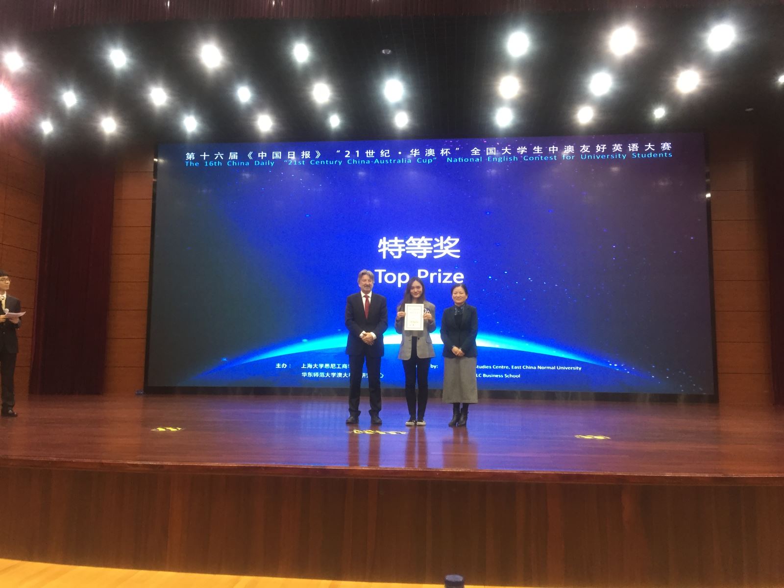 12月15日,第16届“21世纪·华澳杯”大学生中澳友好英语大赛在上海大学嘉定校区成功举办。来自上海、安徽、山东、江苏、浙江等省市27所高校的选手参加了本次角逐。最后,来自万象城网页版,万象城(中国)的选手林曾汇(2018级英翻专业本科生)脱颖而出,夺得大赛特等奖的桂冠,指导老师冯予力获最佳指导教师奖。