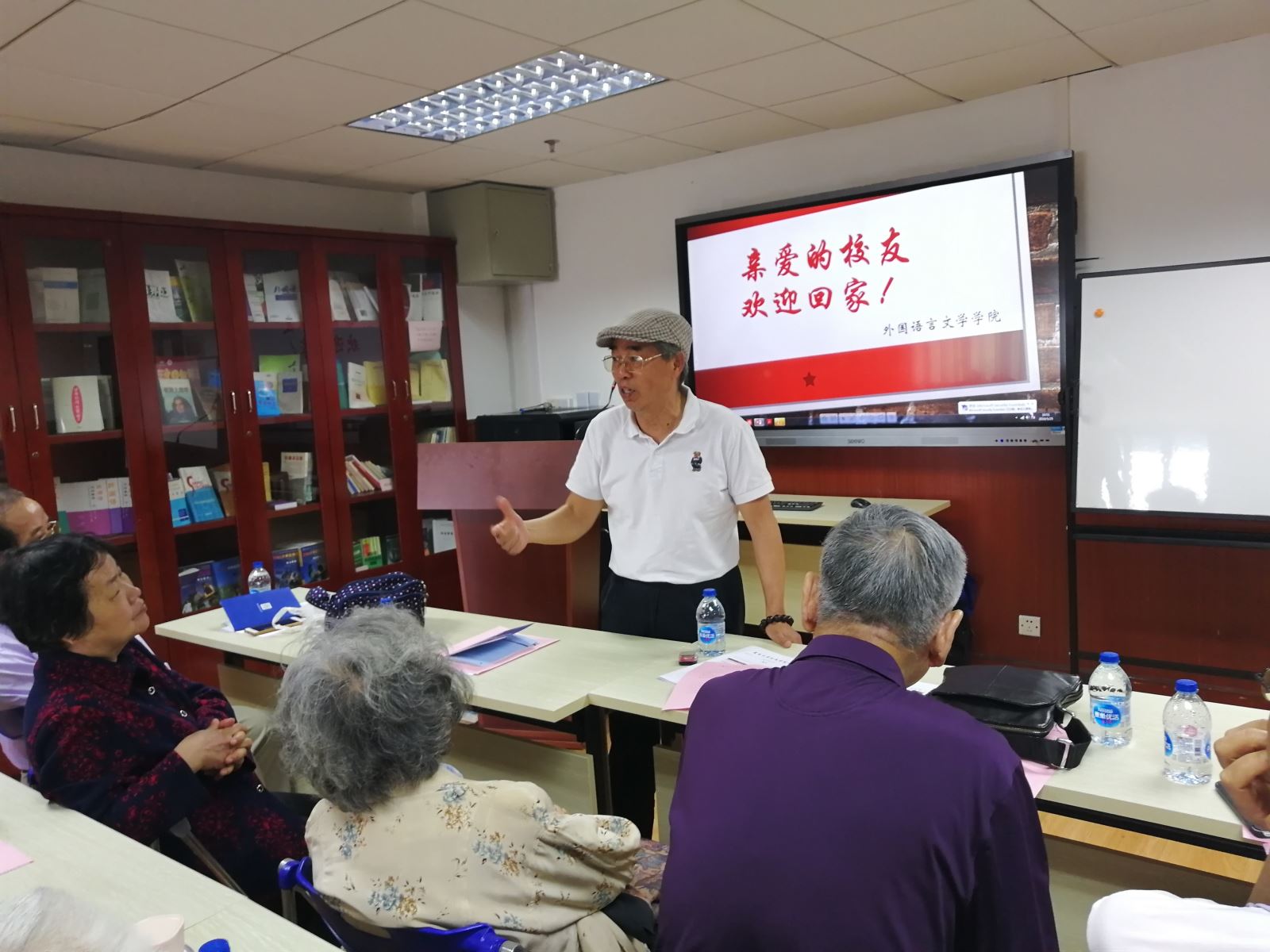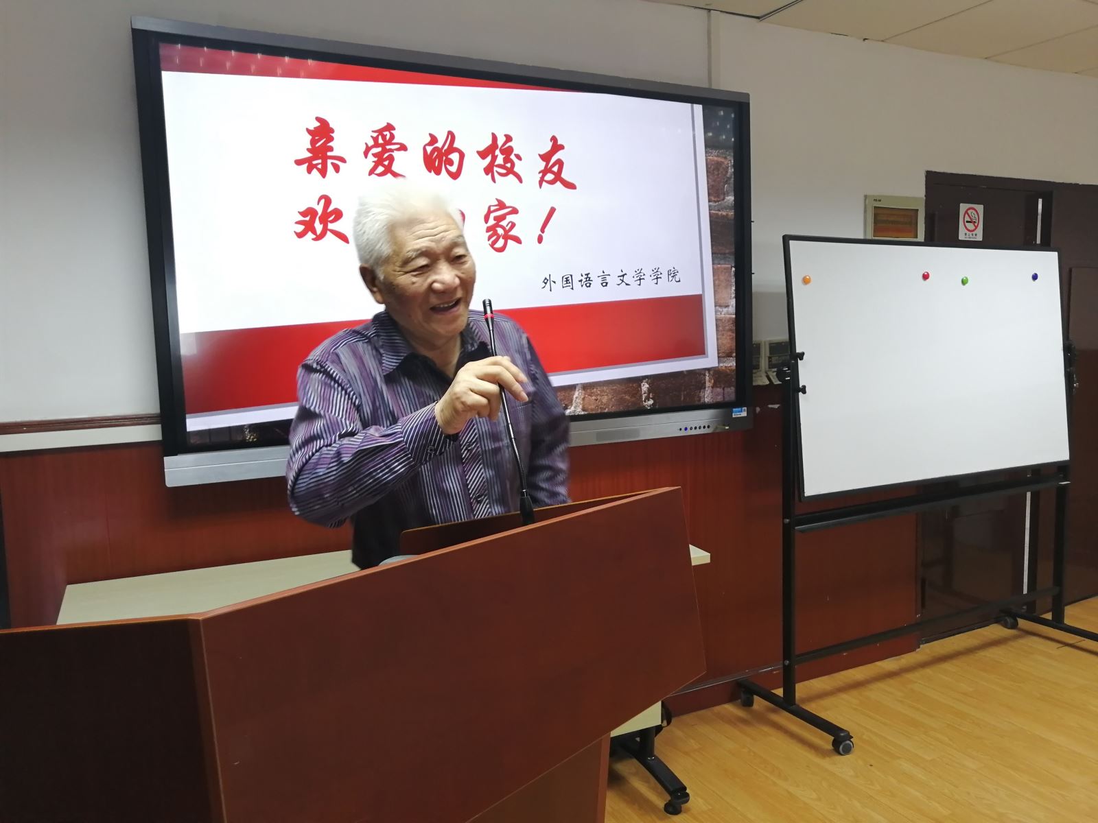 外文学院原党委书记徐龙顺校友,回顾了自己入学和工作时的往事。他表示,学院从曾经的语种单一、规模小发展为现在语种丰富、规模大,这是值得欣喜的。他祝愿学院蒸蒸日上,未来更好。