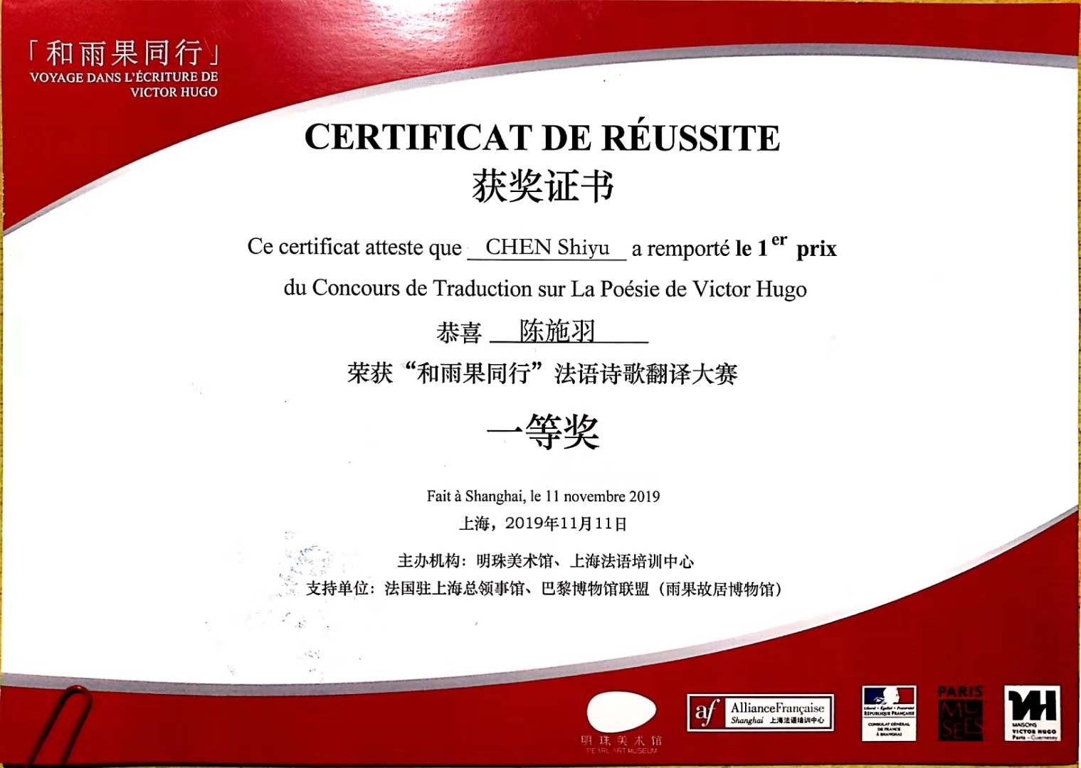 2019年11月11日,“和雨果同行”诗歌翻译大赛颁奖典礼在上海明珠美术馆·心厅隆重举行。经过层层选拔,复旦外文学院法文系本科三年级学生陈施羽同学在众多参赛选手中脱颖而出,成功荣获诗歌翻译大赛第一名,并在颁奖礼上朗读自己的译文,与在场的观众和获奖选手们共同感受诗歌语言的魅力。
