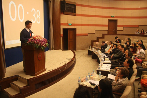 12点半,比赛在逸夫楼报告厅正式拉开帷幕。厅内座无虚席,气氛热烈。在已备演讲部分,选手们就本届大赛定题演讲题目"Change the Unchangeable"各抒己见,声情并茂,异彩纷呈。即兴演讲部分为现场抽题,台上准备时间一分钟,然后进行三分钟的演讲和两分钟的问答。在这一极具挑战的环节,选手们各显神通,滔滔不绝,现场高潮迭起。