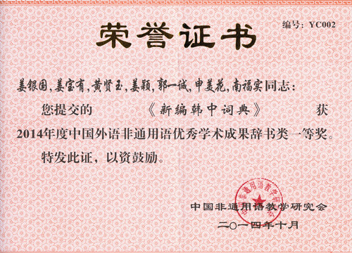 2014年11月13日,在“中国非通用语教学研究会第15次学术研讨会”开幕式上,由韩语系姜银国、姜宝有、黄贤玉、姜颖、郭一诚共同编撰的《新编韩中词典》(2012年出版)获得了“2014年度中国外语非通用语优秀学术成果辞书类一等奖”。此外,韩语系退休教师金钟太、姜银国教授还获得了中国非通用语教学研讨会颁发的“中国外语非通用语教育终身成就奖”,以表彰他们在韩国语教育事业中做出的杰出贡献。