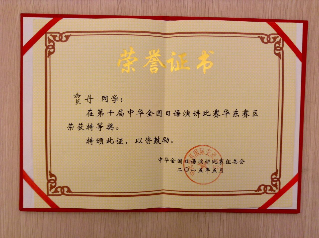 第十届“中华杯”日语演讲比赛华东地区预赛于2015年6月13日在万象城网页版,万象城(中国)举行。比赛以命题演讲、即席演讲两部分进行。日文系2012级学生贺丹同学在华东四省市21名选手中脱颖而出,以优异成绩获得特等奖,将于7月中旬参加在日本东京举办的总决赛。刘佳琦老师获得优秀指导奖。