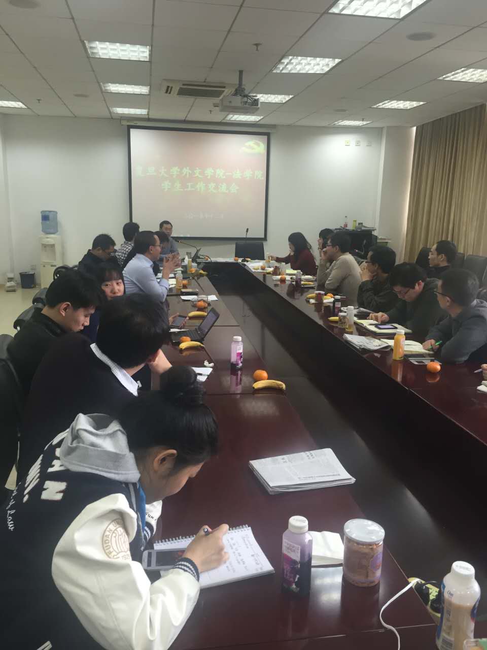 2015年12月3日中午,副书记赵昕老师带队赴江湾法学院,在廖凯原楼202会议室与法学院学工组进行座谈学习,邀请法学院辅导员就“学生事务中的法律问题”做专题报告。2013法学本科生辅导员江国强谈了“学生管理中的法律意识培养”、2014法学本科生辅导员杨军谈了“本科生学生申述、投诉”、2014法硕辅导员孔凡洲谈了“研究生学生申述、投诉”、2014法学硕辅导员涂云新谈了“教育法与学生工作”,四位老师结合理论与实际,深入浅出的讲解,给我院辅导员上了生动一课,让大家对学生工作中的法律问题和法律意识有了更为深刻的理解。
