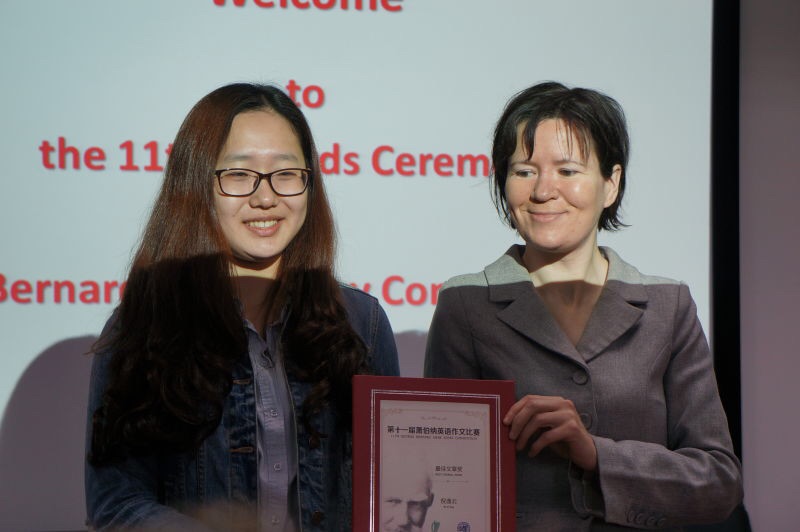 经过爱尔兰方专家评阅,最终2014级英语专业的倪逸云同学获得了本次比赛的最高奖, 高士琳、 蒲文妍和孙予聪三位同学荣获了优秀作文奖。颁奖仪式后,来自爱尔兰都柏林大学的Jerusha McCormack教授为到场的师生作了一场题为《萧伯纳在中国》的精彩讲座。