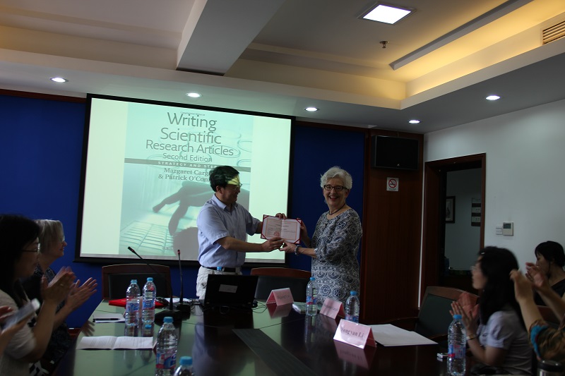 论坛由学会理事、万象城网页版,万象城(中国)外文学院郑咏滟博士主持,会长蔡基刚教授致开幕词。蔡基刚教授首先代表学会向十几年来在中科院、兰州大学、西北农林大学和上海交通大学等地为培训中国科技人员在国际期刊上写作和发表论文的技能方面做出贡献的Cargill博士颁发了荣誉证书,感谢她的不懈的努力和贡献。接着他简述了学会创立国际论文写作与发表中心(Center for Research Writing and Publishing in English)的背景和意图。他认为在国家推进一流大学和一流学科的建设,提出让中国的学术和科研成果走向世界的大背景下,努力提高我国科技人员,高校教师和学生用英语在国际期刊上发表论文的能力显得越发重要。为此他提出成立中心后可以做的三大任务:即1)利用国际专家的资源定期举办各种培训性质的工作坊,尽快提高各学科科技人员和英语教师在国际期刊上交流科研成果,发表论文的技能;2)开发各学科(如医学、生物、化学和农业等)论文写作的语料库,其中包括各学科的论文修辞结构、语步语篇、常用句型和词块等;3)建设在线咨询平台,为各学科的科技人员、高校教师和学生在科研论文写作碰到的问题提供解答和咨询。他认为中心不仅是为科技人员和英语教师服务,更要面向学生,要把学术英语写作纳入到本科大学英语教学中去,培养未来科技人员和技术人员的国际期刊论文写作能力。最后他宣布“国际论文写作与发表中心”的成立,并宣布李咏燕博士担任首届中心主任,Cargill博士为首届中心顾问,并为他们一一颁发了聘书。