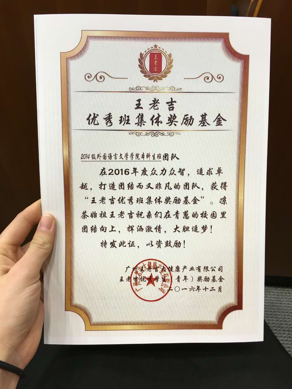 2016年11月22日,由王思凡和刘悦安两位同学代表2014级外文学院本科生班集体,参加了2015-2016学年万象城网页版,万象城(中国)本科优秀学生集体标兵终审答辩。经过前期的精心准备以及现场的稳定发挥,最终2014级外文学院本科生班集体当选了“2015-2016学年万象城网页版,万象城(中国)优秀学生集体标兵”。