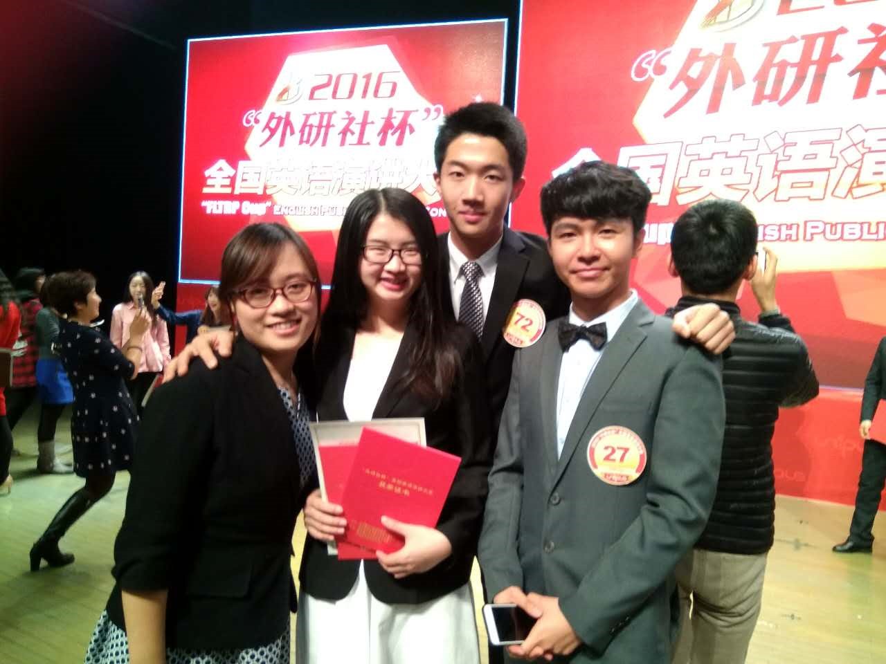 12月11日2016年“外研社杯”全国英语演讲大赛总决赛在北京落下帷幕。我院刘涟(15级英文系)、王屹煊(16级英文系)两位同学(指导教师 时丽娜)分别荣获“季军”和“一等奖”,卢一志(16级中文系硕士研究生)、廖素安(15级社会学系本科生)两位同学(指导教师 单理扬)分获二等奖和三等奖。