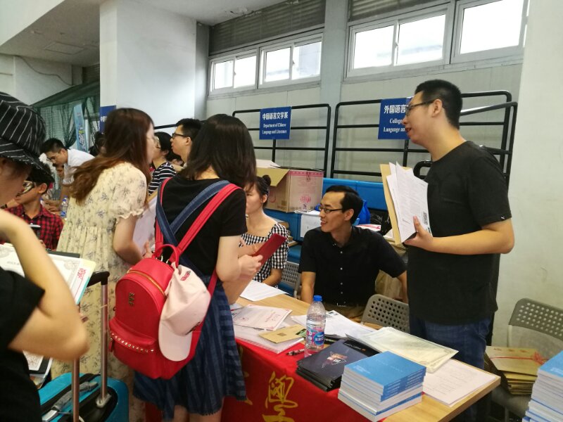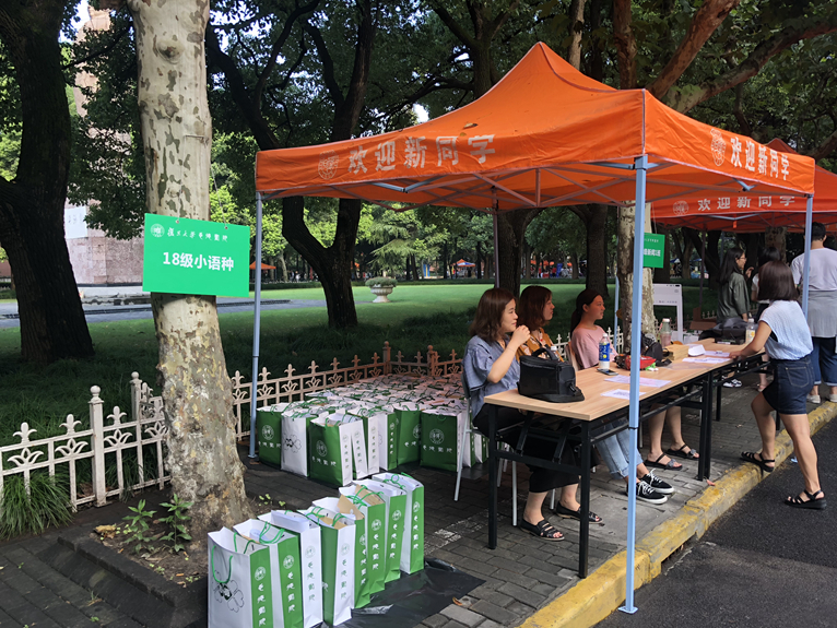 上午七点半,学院迎来第一位新生——来自马来西亚的法文系留学生王靖惟,新生们陆续前来报到,领取大礼包,并与班牌合影留念。