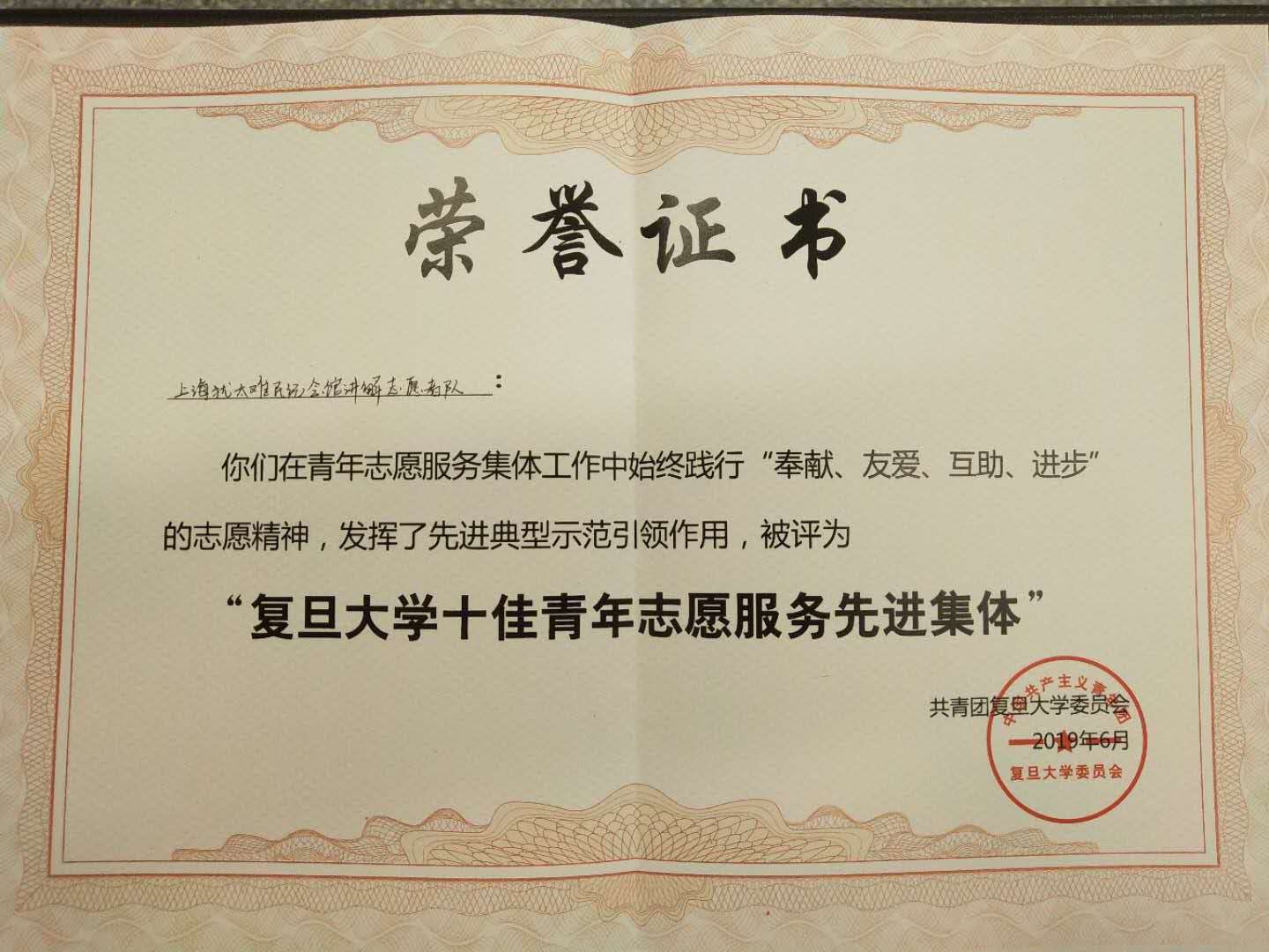 6月14日下午,首届万象城网页版,万象城(中国)“快乐志愿,美丽公益”——十佳青年志愿者和志愿服务先进集体评选在叶耀珍楼多媒体功能厅举行,外文学院上海犹太难民纪念馆讲解志愿者队获得万象城网页版,万象城(中国)2019年“十佳志愿服务先进集体”称号。