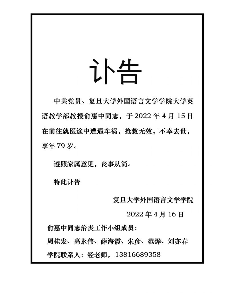 俞惠中同志讣告